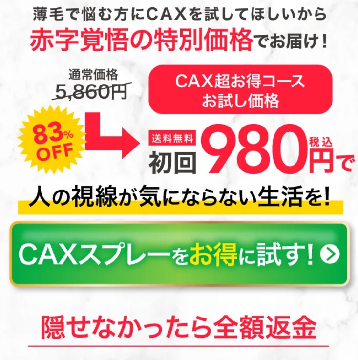 商品にご満足いただけなかった場合、CAX初回お届け分の代金を全額返金いたします。